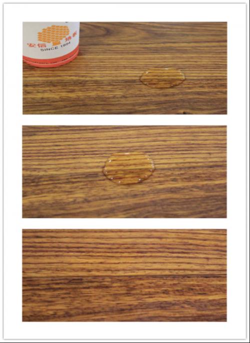 小編將水滴在兩塊地板的縫隙處,靜置幾分鐘,觀察水珠沒有滾動和擴(kuò)散的現(xiàn)象,幾無滲透,擦拭干凈后,地板表面也未出現(xiàn)變色情況。可見,此款地板有著很好的防水性能。