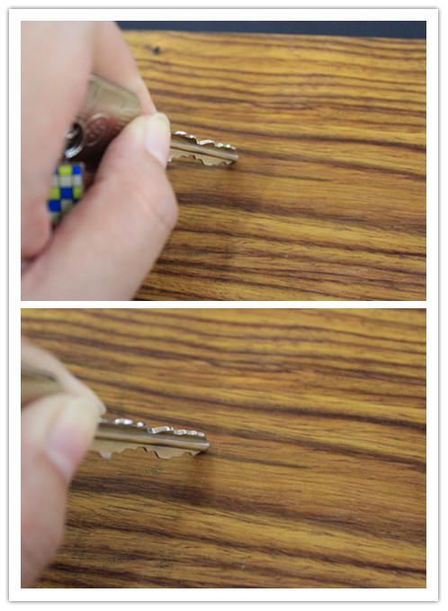 安信非洲花梨植物油實木地板,聽名稱就知道,這款地板在選材上使用的是高檔珍稀木材——非洲花梨。其力學(xué)性質(zhì)好,耐久性強(qiáng),耐磨性好,是地板、家具和櫥柜的理想用材。為了證實這一特質(zhì),小編將鑰匙對著地板表面,使用一定的力道在地板表面多次劃擦,觀察地板表面,無明顯劃痕,表面完好無損。可見,此款地板耐磨性能非常不錯。