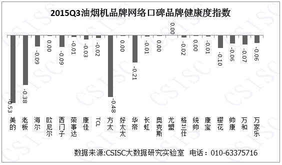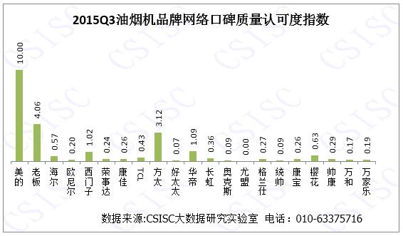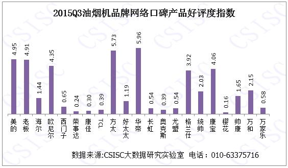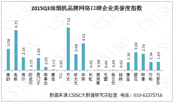 根據(jù)監(jiān)測數(shù)據(jù)可見,老板、方太、美的、華帝等品牌表現(xiàn)較好,尤其是方太油煙機憑借其在口碑總指數(shù)的6個維度的穩(wěn)定表現(xiàn),從而在2015年第三季度油煙機行業(yè)品牌口碑中拔得頭籌。康佳、尤盟、奧克斯等品牌油煙機的口碑總指數(shù)表現(xiàn)不佳,而與2015年第二季度口碑TOP10相比,華帝排名有所上升,從二季度的口碑總榜的第五位次上升至第三,主要得益于其在產(chǎn)品好評度的突出表現(xiàn)。