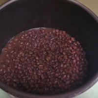 1. 將水和紅豆放進高壓鍋中壓熟。水的量加到?jīng)]過紅豆一手指節(jié)的高度。紅豆無需提前浸泡。這是壓熟的紅豆。