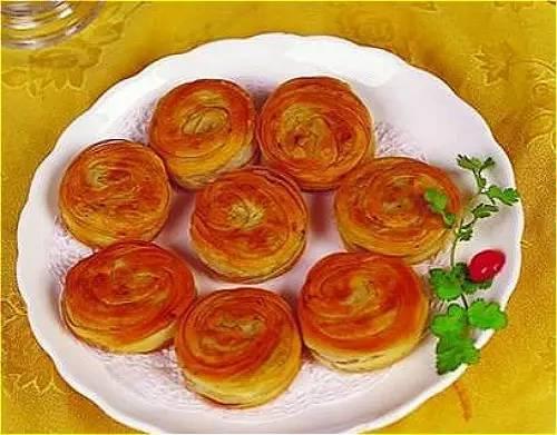 千層油酥餅是陜西漢族特色小吃。色澤金黃、層次鮮明、脆而不碎、油而不膩、香酥適口。相傳,油酥餅是由唐代的千層烙餅,經(jīng)歷代廚師不斷精心改進而成。經(jīng)制酥、和面、制餅、煎烤而成。