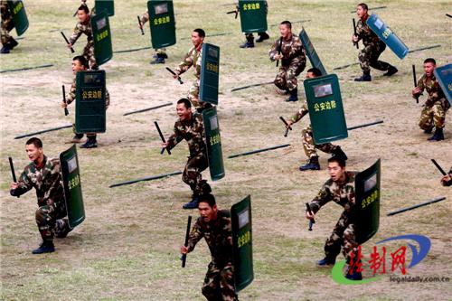 圖為老兵拿著警棍盾牌、特戰(zhàn)棍沖上訓(xùn)練場會(huì)操