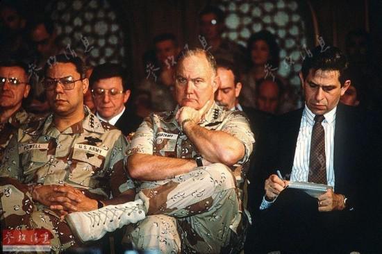 圖為1991年2月,時任美軍參聯(lián)會主席的鮑威爾(左)與多國部隊(duì)總司令施瓦茨科普夫(右)在出席媒體發(fā)布會。
