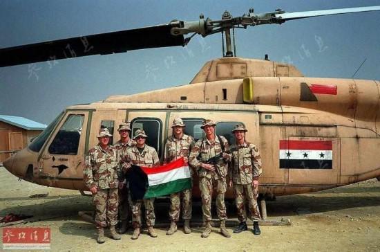 圖為隸屬于美海軍陸戰(zhàn)隊(duì)第3飛行聯(lián)隊(duì)的士兵們在一架繳獲的伊軍貝爾214ST直升機(jī)前合影,攝于1991年2月1日。