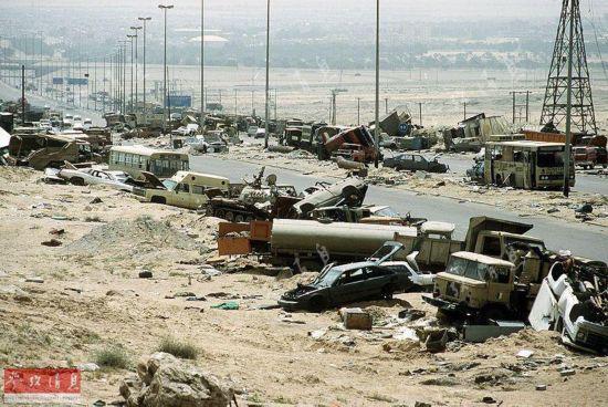 圖為80號高速公路上,被遺棄或摧毀的伊軍車隊(duì),攝于1991年4月18日。
