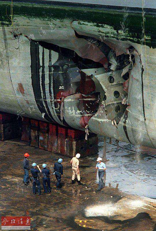 圖為1991年2月1日,美軍修理人員正在檢查被伊軍水雷炸傷的的黎波里號掃雷母艦(LPH-10)。