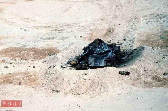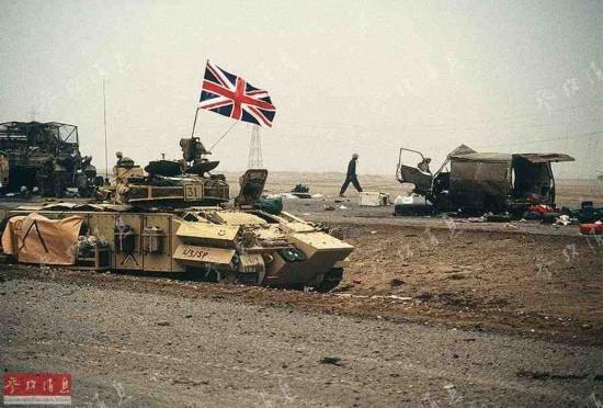 圖為隸屬于英國陸軍第7裝甲旅的一輛武士步兵戰(zhàn)車在伊軍從科威特城撤退后,在通往巴士拉的高速公路上升起了英國國旗,攝于1991年2月28日。