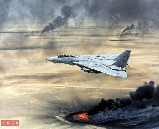 圖為隸屬于美海軍VF-211艦載戰(zhàn)斗機(jī)中隊(duì)的F-14A戰(zhàn)斗機(jī)飛越被點(diǎn)燃的科威特油田,攝于1991年2月1日。