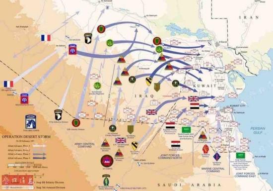 圖為1991年(1月17日至2月28日)沙漠風(fēng)暴行動期間,多國地面部隊(duì)針對伊拉克發(fā)動地面戰(zhàn)過程示意圖。