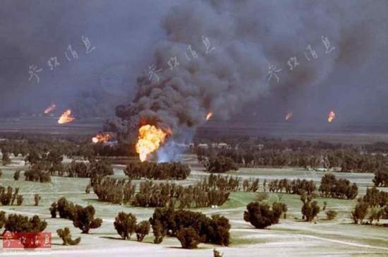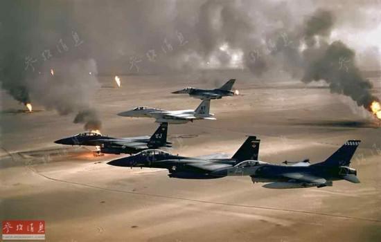 圖為沙漠風(fēng)暴期間,美空軍的F-16C、F-15C戰(zhàn)斗機(jī)與F-15E戰(zhàn)斗轟炸機(jī)編隊(duì)飛行,背景為被伊拉克陸軍點(diǎn)燃的油井。