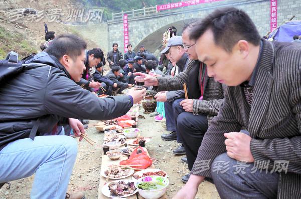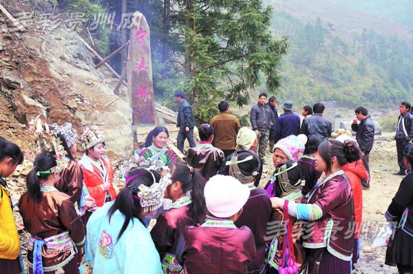 1月18日,從江縣加榜鄉(xiāng)舉行“寧波橋”通車典禮。當(dāng)?shù)厝罕娚泶┟缱宸b,吹起蘆笙跳起舞,歡迎前來參加典禮的寧波愛心人士,場面異常熱鬧。