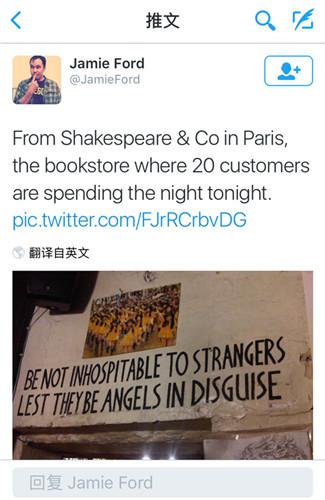 據(jù)美國(guó)《新聞周刊》17日?qǐng)?bào)道,巴黎恐襲當(dāng)晚,警笛聲取代了游客在戶外書架翻閱和角落里街頭藝人表演的聲音。在巴黎發(fā)生六處恐怖襲擊后,法國(guó)進(jìn)入警備狀態(tài),警察告訴巴黎人呆在室內(nèi)。莎士比亞書店也關(guān)閉了大門。但它成為黑暗里的避難所。