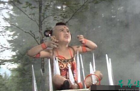 這一幅劇照是紅孩兒的造型,畫紅圈處腿部的利器是用透明膠布貼上的。個(gè)..居然找個(gè)女的來演 ,第三個(gè)的造型師是想讓大家知道佛教是起源于印度的,長的好像囧崗山啊..囧崗山..