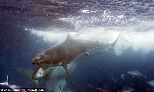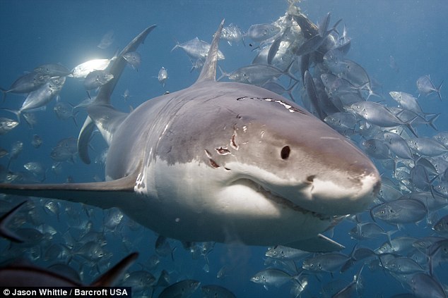 新浪科技訊北京時(shí)間12月8日消息,在這些罕見(jiàn)的圖片中,攝影師捕獲了一條五米長(zhǎng)的雌性大白鯊咬住一條年輕大白鯊的情景,因?yàn)楹笳咴噲D和這條雌性大白鯊搶奪食物。這些照片由當(dāng)時(shí)正在潛水的杰森·維特爾(Jason Whittle)拍攝。