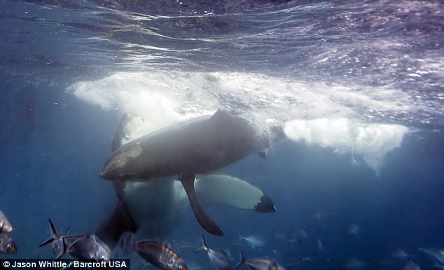 這一幕發(fā)生在南澳大利亞阿德萊德海灘附近的尼普頓群島。當(dāng)時(shí),這條更年輕些的鯊魚(yú)正準(zhǔn)備向自己的獵物下口,而那條雌性鯊魚(yú)也在同一時(shí)間發(fā)起了攻擊。不過(guò),它并沒(méi)有從年輕的鯊魚(yú)身上咬下一塊兒來(lái),只是給了它一點(diǎn)教訓(xùn),就接著去用餐了。