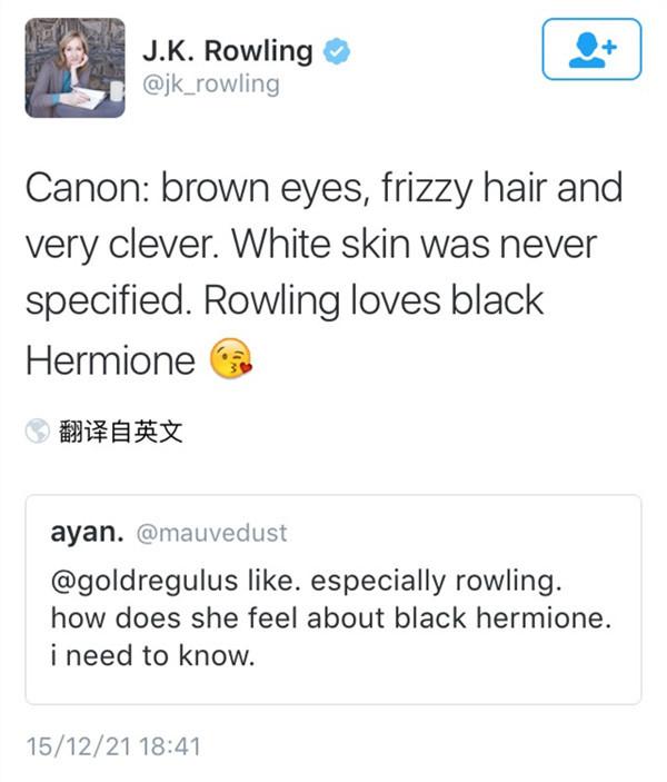 更多人跑到推特問J.K.羅琳對新任演員的感想,她回應(yīng)說,“Canon:棕眼睛,小卷發(fā),高智商。從沒人說過赫敏一定是白皮膚。我很喜歡黑人赫敏。”