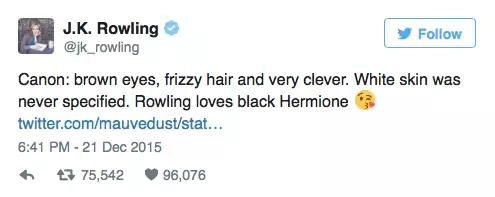 艾瑪表態(tài)暗示了她將會在今年5月舞臺劇開演時去觀看,《哈利·波特》的作者J·K·羅琳也回擊了網(wǎng)上的批評之聲,發(fā)布推文表示支持這位出生于斯威士蘭的舞臺劇演員諾瑪。「標準:棕色眼睛,卷曲的頭發(fā),非常聰明。從來沒有人說過赫敏必須是白人。羅琳喜歡黑人版的赫敏。」并且在這條消息的最后加上了emoij里的親吻表情。