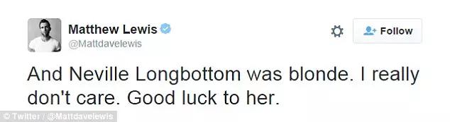 在《哈利·波特》電影里飾演納威·隆巴頓的演員馬修·路易斯(Matthew Lewis)同樣在推特上表達了自己的觀點,他也厭惡社交媒體上某些人對于黒人版赫敏的指責。「納威·隆巴頓還是金色頭發(fā)呢,我真的不在乎,祝她好運。」他指出自己在外型上也不是與書中所寫的納威完全相符,并以此來表達對于諾瑪出演赫敏的支持。