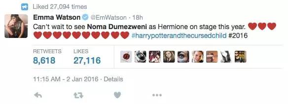 艾瑪上周六在推文中寫道:「迫不及待想要看到今年諾瑪·杜梅茲維妮在舞臺劇中飾演的赫敏了。」并在推文中標注了「《哈利·波特與被詛咒的孩子》(Harry Potter and the Cursed Child)」的標簽,并跟著一連串愛心表情。
