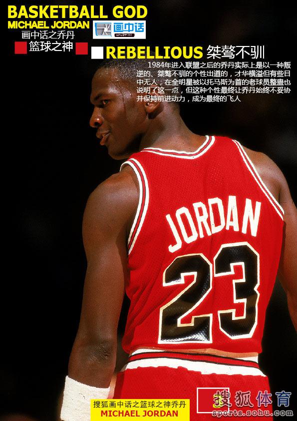 3-畫中話之籃球之神喬丹-桀驁不馴 3.叛逆者 1984年進入聯(lián)盟之后的喬丹實際上是以一種叛逆的、桀驁不馴的個性出道的,才華橫溢但有些目中無人,在全明星被以托馬斯為首的老球員整蠱也說明了這一點,但這種個性最終讓喬丹始終不妥協(xié)并保持前進動力,成為最終的飛人。