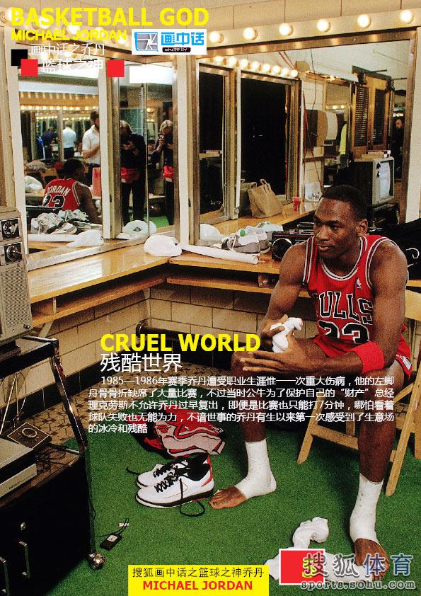 5-畫中話之籃球之神喬丹-殘酷世界 5.殘酷世界 1985—1986年賽季喬丹遭受職業(yè)生涯惟一一次重大傷病,他的左腳舟骨骨折缺席了大量比賽,不過當時公牛為了保護自己的“財產(chǎn)”總經(jīng)理克勞斯不允許喬丹過早復(fù)出,即便是比賽也只能打7分鐘,哪怕看著球隊失敗也無能為力,不諳世事的喬丹有生以來第一次感受到了生意場的冰冷和殘酷。