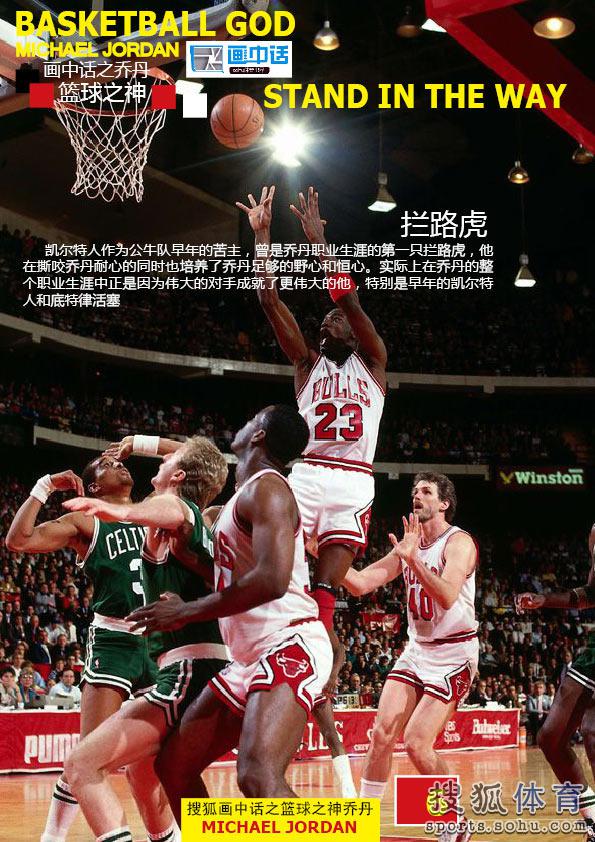 6-畫中話之籃球之神喬丹-攔路虎 6.攔路虎 凱爾特人作為公牛隊早年的苦主,曾是喬丹職業(yè)生涯的第一只攔路虎,他在撕咬喬丹耐心的同時也培養(yǎng)了喬丹足夠的野心和恒心。實際上在喬丹的整個職業(yè)生涯中正是因為偉大的對手成就了更偉大的他,特別是早年的凱爾特人和底特律活塞。