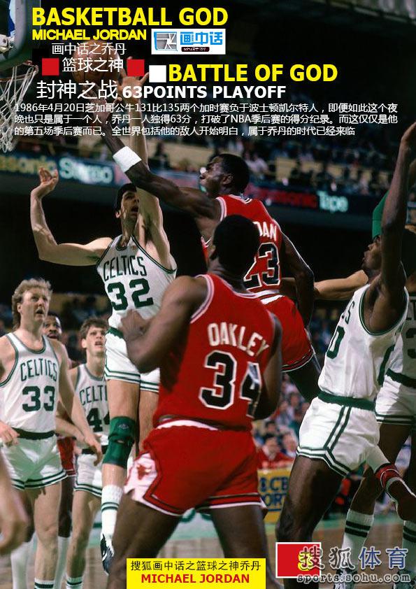 8-畫中話之籃球之神喬丹-封神之戰(zhàn) 8.季后賽豐碑之戰(zhàn) 1986年4月20日芝加哥公牛131比135兩個加時賽負于波士頓凱爾特人,即便如此這個夜晚也只是屬于一個人,喬丹一人獨得63分,打破了NBA季后賽的得分紀錄。而這僅僅是他的第五場季后賽而已。全世界包括他的敵人開始明白,屬于喬丹的時代已經(jīng)來臨。