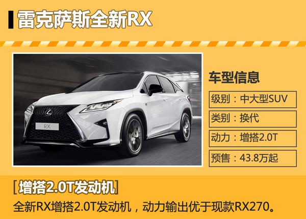 | 全新RX | 中大型SUV | 換代 | 11月12日 |