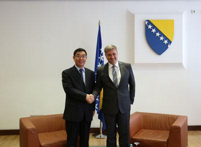 2015年8月10日,駐波黑大使董春風(fēng)辭行拜會波黑部長會議主席(總理)茲維茲迪奇,茲辦公室主任、中國-中東歐國家合作波黑國家副協(xié)調(diào)員尼克希奇陪同。