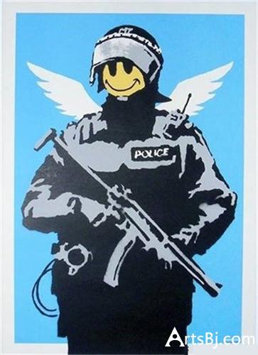 他幽默并飽含政治嘲諷與社會批判的作品為當(dāng)時充斥著享樂主義以及反叛意識的倫敦藝術(shù)圈做出了完美注解。從接吻的警察到乘坐舊塑料袋飛走的孩子,每一件班克斯的作品都在傳遞明確的信息。當(dāng)時最有爭議的作品之一,也許就是在美國第二次入侵伊拉克時出現(xiàn)在東倫敦繁華街頭的一件作品——一位一身武裝的士兵的臉部被笑臉圖標(biāo)替代——旁邊的標(biāo)語則顯得格外扎眼:“祝你今天愉快。”