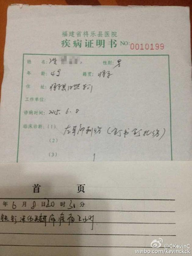 隨后,孩子被送往醫(yī)院處理傷口。而據(jù)該網(wǎng)友上傳的醫(yī)院診斷書顯示,幼童“左耳廓見鐵釘刺傷傷口”,臨床診斷為“左耳廓刺傷(釘書釘扎傷)”。