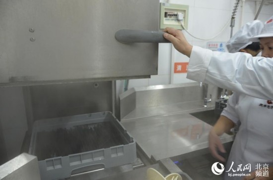經(jīng)過人工清洗的餐具,要進入高溫消毒蒸汽中進行消毒。人民網(wǎng) 尹星云 攝