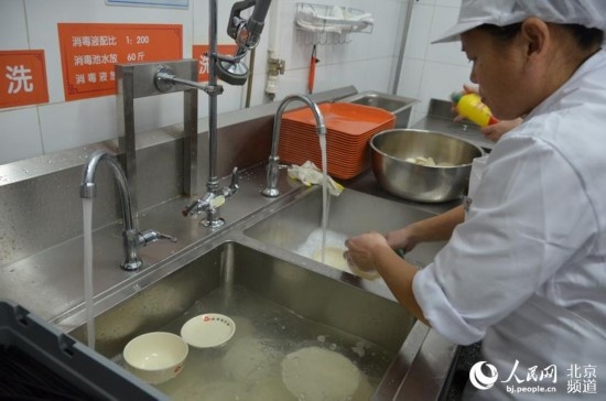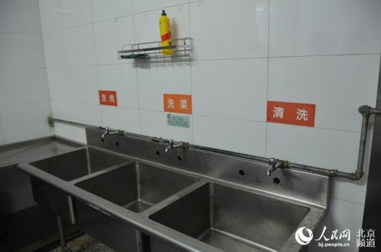 干凈整潔的后廚清洗間,肉、菜池分離,潔凈衛(wèi)生又井然有序。人民網(wǎng) 尹星云 攝