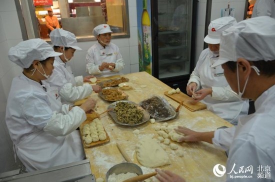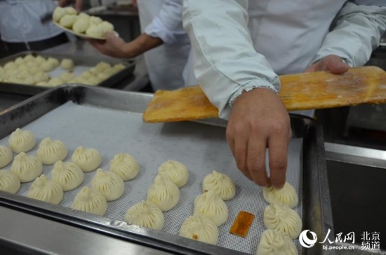 位于繁華地段的慶豐包子鋪西單店內(nèi),“明廚亮灶”的設(shè)計,即使在門店,包子制作過程也可以一目了然。人民網(wǎng) 尹星云 攝