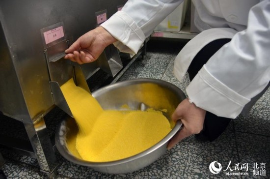 取用雜糧,通過小窗口人工控制數(shù)量,有限減少了人手與大量儲備原材料的接觸。大家在店鋪里喝的粥,原料就是從這里取出來的。人民網(wǎng) 尹星云 攝