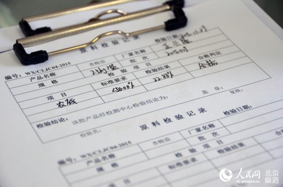 慶豐包子餡料配送中心檢測室,此時正在檢測的是香菇、蔬菜等農(nóng)藥殘留,工作人員記錄下檢測結(jié)果。人民網(wǎng) 尹星云 攝