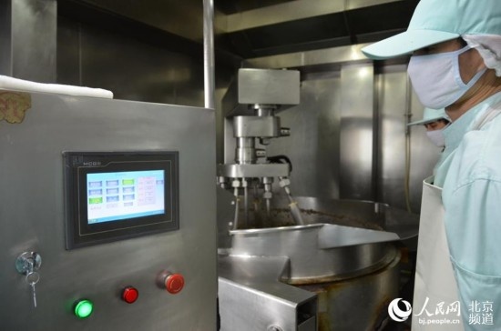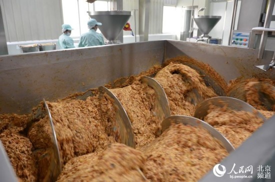隨后,車間工人用另一臺灌裝設(shè)備將餡料分裝成標準帶。人民網(wǎng) 尹星云 攝