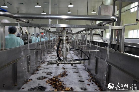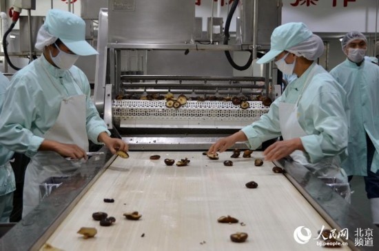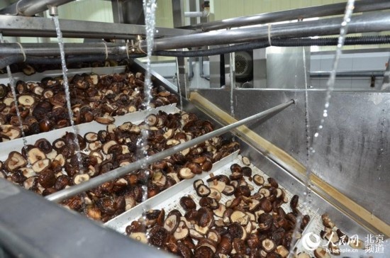 篩選好的干菜被送進下一間蔬菜加工車間進行泡發(fā)與洗滌。蔬菜全自動清洗流水線正在工作,洗凈的香菇躺在傳送帶上經(jīng)過清水淋浴,再經(jīng)過人工檢查,剪掉香菇的硬梗,然后壓出多余水分。人民網(wǎng) 尹星云 攝