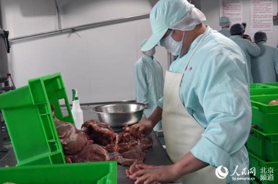 “我們只用2號肉,就是俗稱的前臀尖,這個部位是純瘦肉。”一進入肉類加工間,工作人員就向小編介紹說。圖為車間員工逐塊檢查豬肉上是否有骨頭、肉筋,檢查合格的豬肉才可以被投入絞肉機。人民網(wǎng) 尹星云 攝