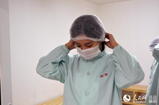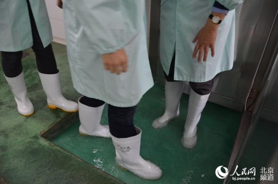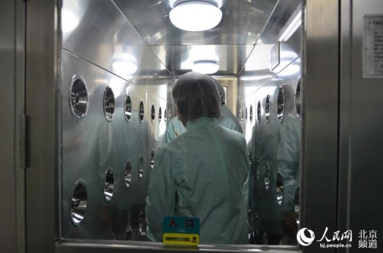 為保證生產(chǎn)車間的絕對清潔,小編也換上了長及膝蓋的工作服、雨靴、口罩、防塵帽,按要求,最上面的扣子也要扣上,所有頭發(fā)塞入帽中,才可以進入“緩沖間”。工作人員說,這是他們每天的裝束,所有人只有眼睛和手露在外面。人民網(wǎng) 尹星云 攝