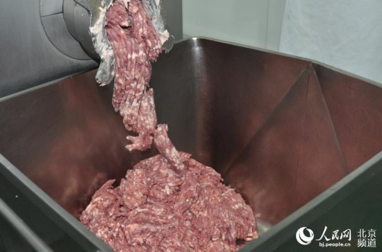 投入絞肉機的豬肉,按嚴格比例與肥膘一起攪成肉餡。人民網(wǎng) 尹星云 攝