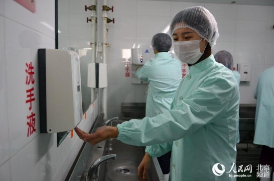 圖為小編正在取出洗手液。進入生產(chǎn)車間的消毒更為嚴格,除了身著清潔裝備之外,小編還要按步驟進行洗手、酒精消毒、雨靴消毒、風(fēng)淋通道等環(huán)節(jié),才可以真正走進慶豐包子餡料加工車間。為保證清潔,在消毒全程,手不可以接觸清潔設(shè)備。人民網(wǎng) 尹星云 攝