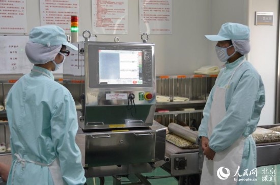 裝袋后的每袋餡料,都要經(jīng)過“X光異物檢測儀”的檢查才能入庫。“檢測儀非常精準,0.6毫米直徑的異物都能被發(fā)現(xiàn)。”廠常務(wù)經(jīng)理徐林介紹道。人民網(wǎng) 尹星云 攝