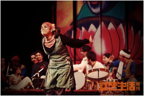 演員交替著從小舞臺走到前面來,樂手配合著敲打著手鼓、風(fēng)琴等印度民族樂器。其余的演員會坐在小舞臺上,抑或擔(dān)任和聲,抑或配合劇情形成各種有趣的肢體與表情。在表達(dá)主角內(nèi)心的愛與傷感時,穿插著各種歌曲與印度舞蹈。