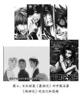 除了《三國演義》和《紅樓夢》被惡搞外,《西游記》也未能幸免。日本動漫《最游記》塑造了四位型男主角(見圖4),但人物都沿用了《西游記》中唐僧師徒四人的名字,主要講述四位主人公為阻止牛魔王復活而進行的種種冒險。這是一部搞笑冒險類動漫,其中的唐三藏脾氣暴躁愛抽煙,沙悟凈離不開煙酒和女人,觀音菩薩的人物特點是穿著暴露。雖然官方一再申明此動漫和《西游記》無任何劇情關聯(lián),但借用中國《西游記》主人公的名字并極力丑化和惡搞他們,對中國觀眾而言是一種極不負責任的文化褻瀆,它顛覆了中國讀者對《西游記》的美好記憶。而另一部作品《日和》,不僅借用《西游記》的人物形象,甚至還出現(xiàn)了唐僧師徒吃掉豬八戒的荒誕劇情,這些都會對中國的傳統(tǒng)文化帶來深遠的負面影響。