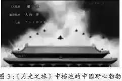 日本動漫對中國形象的丑化,不僅僅體現(xiàn)在傳統(tǒng)文化方面,而且對現(xiàn)代文化元素也極盡丑化之能事,如對天安門等標志性符號形象的丑化即是最好的例證。在《月光之旅》中,幾乎每一集都有妖魔化中國的內容。在描寫中國的時候,往往會出現(xiàn)極具諷刺意味的天安門形象,而動漫中的中國領導人會經常宣稱:中國要在月球上開發(fā)資源,世界各國從月球上開發(fā)來的資源應該公平分配,月球的資源不能由美國獨占,為此中國獨自進行月球開發(fā)“長征計劃”。在整部作品中,《月光之旅》對中國天安門、中國閱兵式、中國航天精神、中國國家領導人、中國軍人的形象以及中國對待世界的態(tài)度等都進行了扭曲(見圖3)。這種想當然的描述,把中國塑造成一個野心勃勃的危險國家,把中國與美國對立起來,傳遞中美敵對思想,宣揚中國威脅論。從長遠來看,這類不負責任的臆想對青少年的精神世界是一種極壞的沖擊。