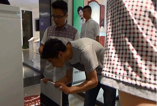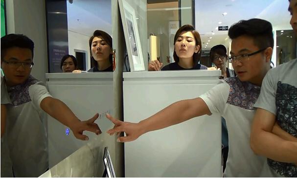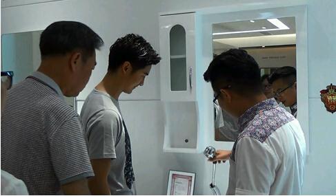 曾小羚:“我給你介紹這款RF89076S-03智能實(shí)木浴室柜,它不僅能滿足基本的浴室使用需求,可以播放音樂,電影”