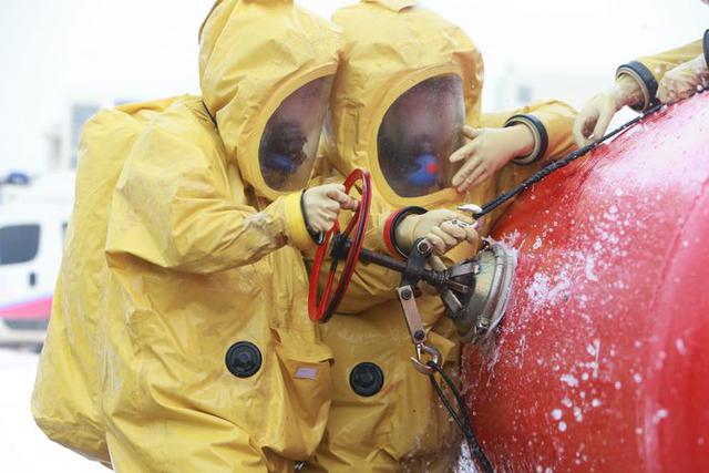 在16日早上進(jìn)行的化工火災(zāi)撲救項(xiàng)目中,現(xiàn)場(chǎng)模擬化工廠露天倉(cāng)庫(kù)存放若干有毒可燃?xì)怏w和液體儲(chǔ)罐,某油罐發(fā)生少量泄漏并形成流淌火,參賽消防員到達(dá)現(xiàn)場(chǎng)后,先通過災(zāi)情偵察,偵檢“泄漏”的危化品,確定泄漏危化品品種后,3分多鐘的時(shí)間消防員完成了滅火和堵漏操作。“針對(duì)我省化工企業(yè)較多的實(shí)際情況,專門設(shè)置本次化工火災(zāi)撲救項(xiàng)目。”湖北省公安消防總隊(duì)?wèi)?zhàn)訓(xùn)處處長(zhǎng)王謀剛說。(何習(xí)文 王方)