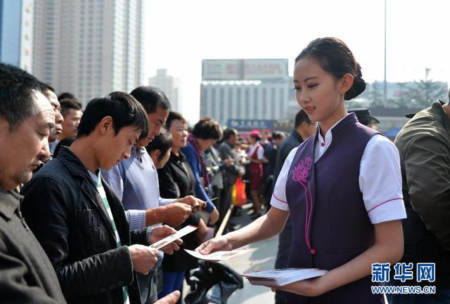9月24日,一位高鐵客運員向市民發(fā)放鐵路宣傳冊。當日,西北地區(qū)最大的高鐵客運站——蘭州西客站面向社會公開招聘的100名客運服務人員經(jīng)過一個月的培訓后正式亮相。百名準“高哥高姐”在蘭州火車站廣場向市民和候車旅客發(fā)放鐵路客貨運宣傳冊,展示高鐵服務禮儀和表演歌舞節(jié)目,為西部鐵路客貨運代言。新華社記者 陳斌 攝