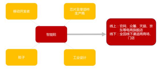 智能鞋產業鏈涉及環節較多,從產業分工維度看大致有芯片及零件生產商、移動開發者、鞋子、工業設計四個環節。